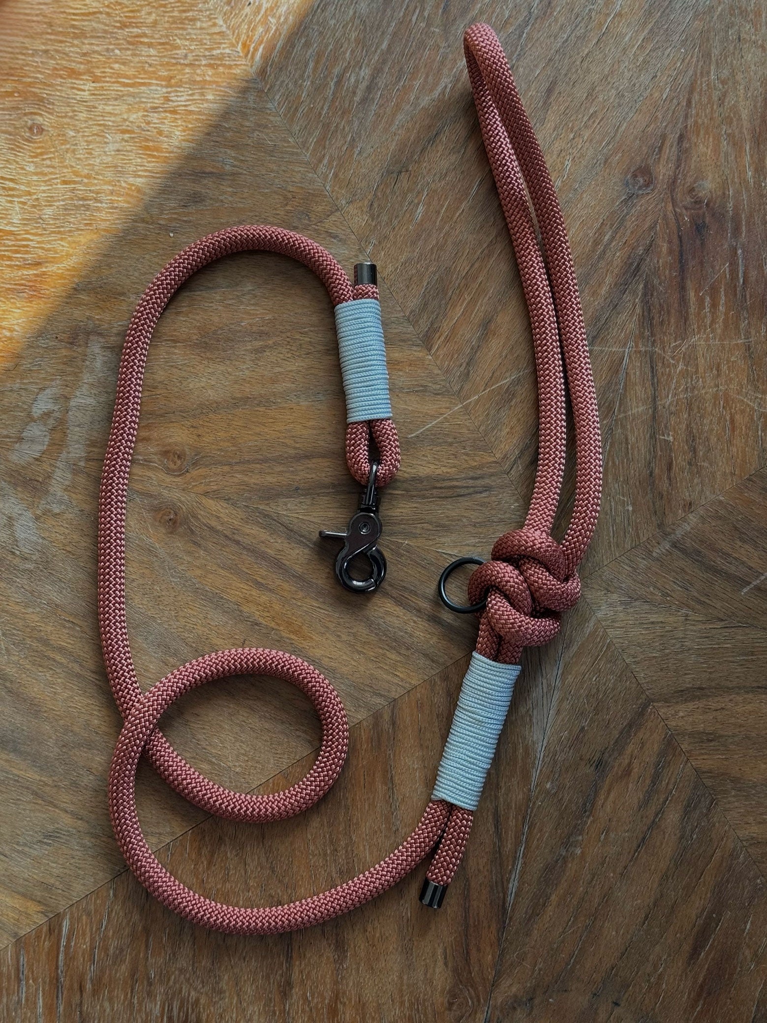 Smycz została wykończona czarnym, solidnym karabińczykiem, który zapewnia pewne zapięcie i dobrze komponuje się z jasnym kolorem liny.