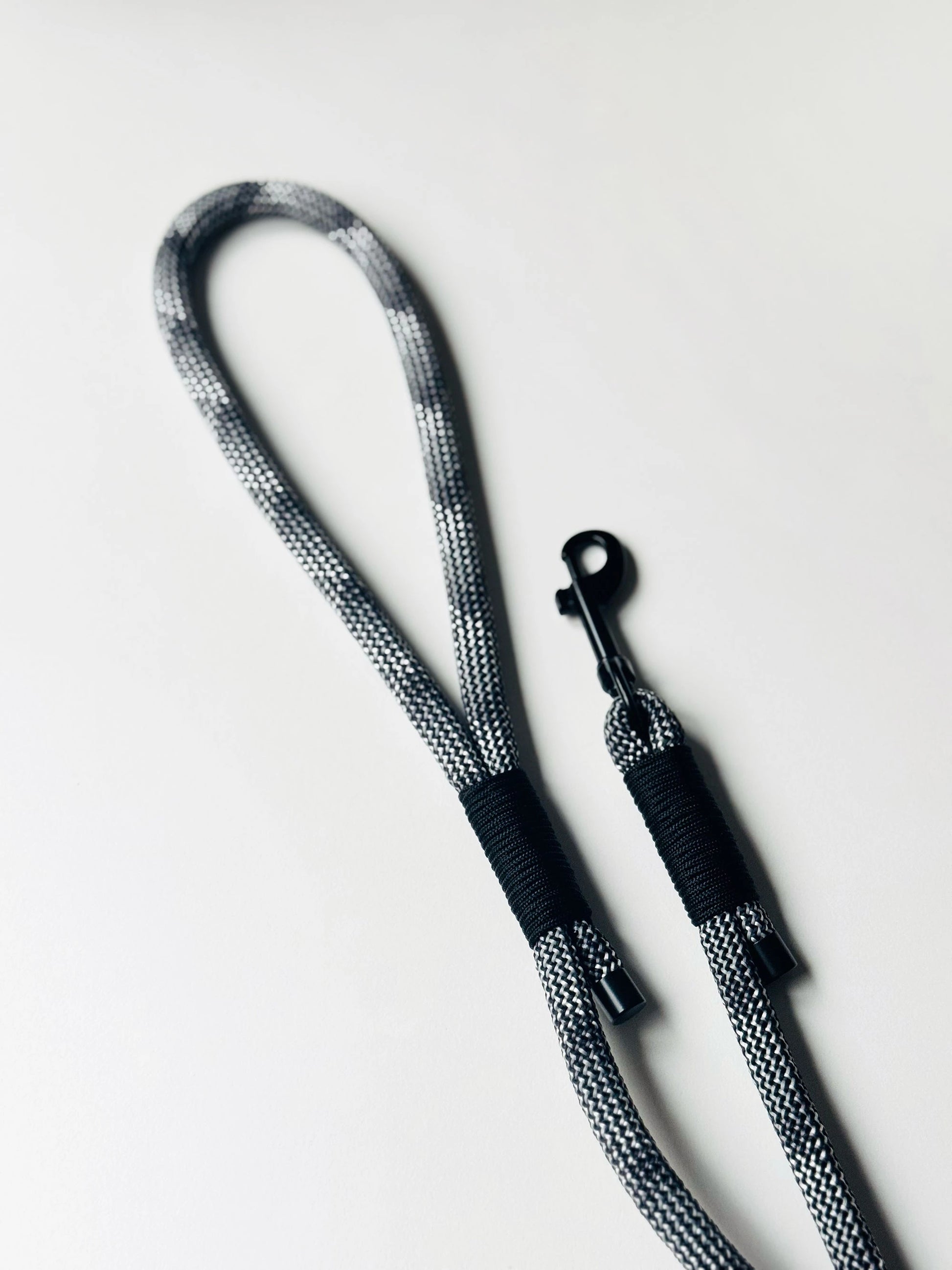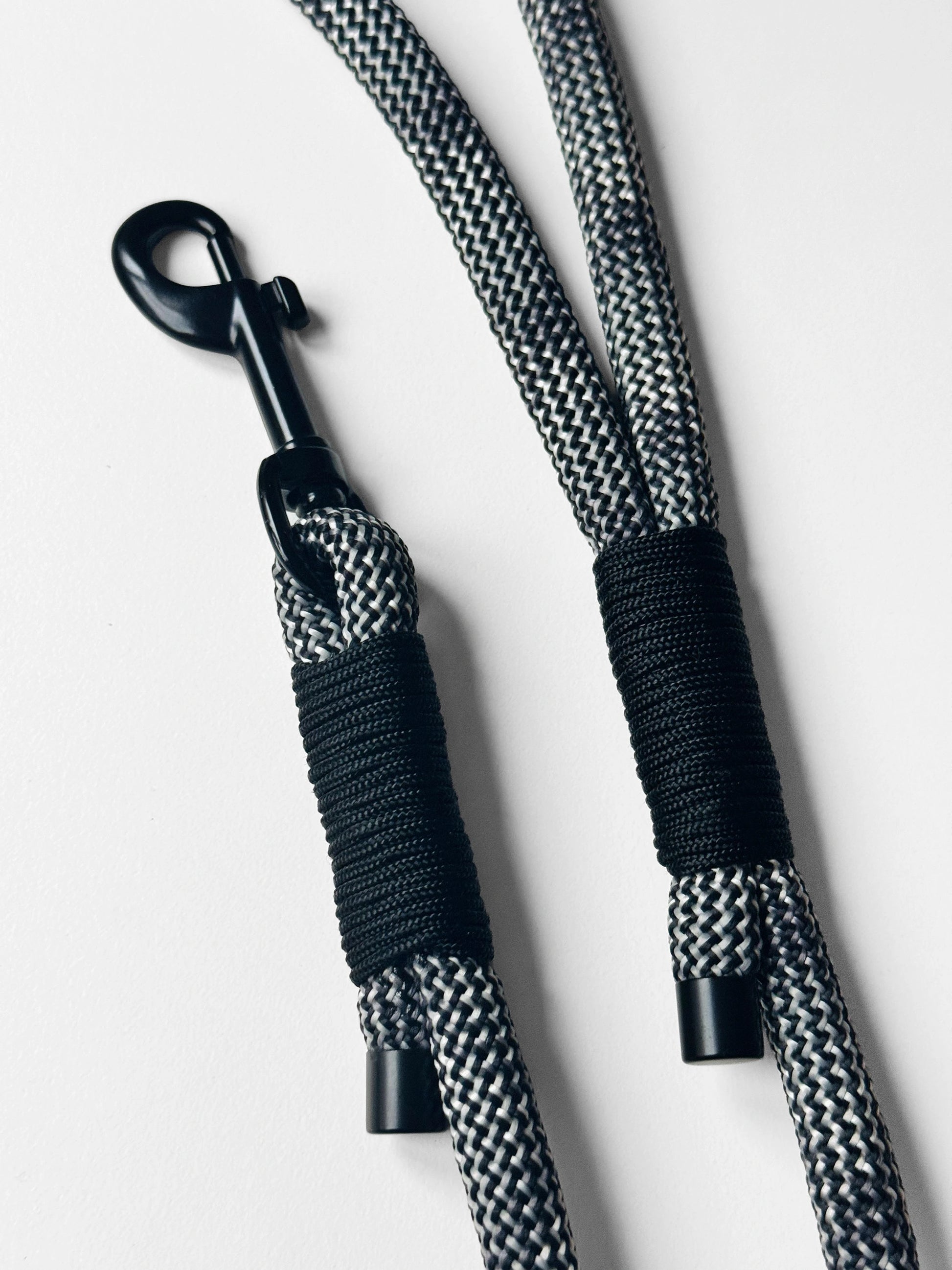 Smycz została wykończona czarnym, solidnym karabińczykiem, który zapewnia pewne zapięcie i dobrze komponuje się z jasnym kolorem liny.